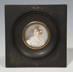 Miniatur. FRANKREICH 19.Jahrhundert, "Biedermeier-Mädchenporträt", Gouache auf Elfenbein, unsigniert, rückseitig auf dem Rahmen alt bezeichnet: Idville, ø 4.5 cm (1 3/4 in), geschwärzter Rahmen mit verglaster runder Messingleiste
