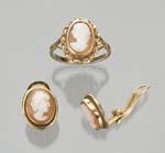 Paar Kamee-Ohrclips, Ring. 750/333er Gelbgold (18/8 ct),