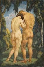 Liebermann, Ernst zugeschrieben. 1869 Langemüß - 1960 Beuerberg, "Männlicher und weiblicher Rückenakt" in Parklandschaft, Öl auf Leinwand, unsigniert, originaler Keilrahmen, 67.5x45.5 cm (26 1/2 x 18 in), ...