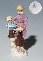 Meyer, Friedrich Elias. 1724 Erfurt - 1785 Berlin MEISSEN 2006, erste Wahl, Modell-Jahr: 1748-1761, Modell-No. 65659 (alte Form-No.E 39), "Japaner mit Vogel im Reifen", farbig bemalt, gold staffiert, Höhe: 12 cm (4 3/4 ...