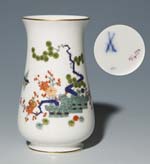 Kleine Indisch-Vase. MEISSEN nach 1934, erste Wahl, farbig bemalt, gold staffiert, "Reisigbüschel mit Vogel", Höhe: 10.5 cm (4 1/8 in), Malermarke, blaue Schwertermarke, Literatur: Meissen: Dekorübersicht Abbildung Seite 50