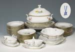 Großes Speiseservice. MEISSEN 1956-1958, zweite Wahl, farbige Blumenbemalung, gold staffiert, "Neuer Auschnitt", 45 Teile: 1 große Terrine, 2 Saucieren, 1 große runde Platte, 2 große quadratische Schalen, 2 große ovale Platten, ...