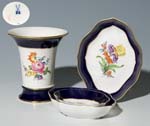Veilchenvase, 3er Satz Konfektschalen. MEISSEN nach 1947, zweite Wahl, kobaltblaue Ränder, farbige Blumenbemalung, gold staffiert, Höhe: 9.5 cm (3 3/4 in), Länge: 8-12 cm (3 1/8-12 3/4 in), Pressmarken, Malermarken, ...