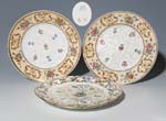 3er Satz russische Blüten-Ornamentteller. POPOW Moskau-Gorbunowo 1820-1830, farbige florale Bemalung, Golddekor, Goldstaffage, partiell cremefarbener Fond, ø 22-23 cm (8 5/8-9 in), blaue Bodenmarken, Literatur: Popow: Russisches Porzellan Marke Seite 282, vgl. ...