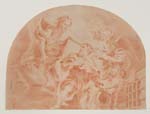 Historienmaler 18.Jahrhundert. "Eris in Peste patronus", der Heilige Rochus im Pilgermantel mit Stab und breitkrempigem Hut vor Christus, ein Engel zeigt die Inschrift, sehr feine Rötelzeichnung, lateinisch beschriftet, am ...