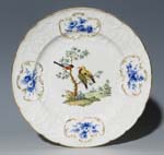 Vogelteller. MEISSEN Ende 18.Jahrhundert, Reliefdekor "Dulong", im Spiegel feine farbige Bemalung, "Vögel in Landschaftsinsel", auf der Fahne florale Malerei in kobaltblau-Camaieu, gold staffiert, ø 25 cm (9 3/4 in), ohne ...