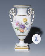 Henkelvase. MEISSEN 1880-1923, erste Wahl, Modell-Jahr: 1833-1835, Modell-No.U 70, beidseits farbige Blumenbemalung, gold staffiert, Balusterkorpus mit Voluten- Handhaben, montierte quadratische Plinthe, Höhe: 22.5 cm (8 ...