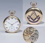 Hamilton. Gold-Freimaurer-Taschenuhr.HAMILTON Watch Co.Lancaster, Zifferblatt, Gehäuse und Werk signiert, 585er Gelbgold-Gehäuse mit gravierten Freimaurer-Symbolen, kobaltblau emailiert, Gold-Innendeckel 1924 datiert, ...