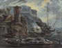 Landschaftsmaler um 1800. "Romantische Küstenlandschaft" mit Fischerbooten vor einer Felsenküste im Morgengrauen, Personen-und Viehstaffage Aquarell, unsigniert, 20.5x26.5 cm (8 x 10 1/2 inch), verglaster alter Goldrahmen
