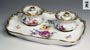 Schreibzeug.DRESDEN Potschappel Ende 19.Jahrhundert farbige Bemalung "Blumen-und Insektendekor", Goldspitzenbordüren Goldstaffage, 3-teiliges MEISSEN-Modell, 1 Paar Tintenfässer, 1 Tablett, die Fässer in vertikal profilierter ...