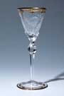 Jugendstil-Stengelglas.LUDWIG MOSER & SÖHNE Karlsbad, Entwurf um 1905, aus dem Service No.7000 "Rose" farbloses, partiell facettiertes, gold staffiertes Glas mit Schnittdekor, umlaufend Blüten, Knospen und Blattwerk Höhe: ...