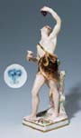 Mythologische Figur.FRANKENTHAL Ende 18.Jahrhundert "Stehender Bacchus mit Kelch und Traube" farbig bemalt, gold staffiert, Blätter und zwei Finger bestoßen, quadratischer Sockel mit Baumstütze, Höhe: 16.5 cm (6 1/2 ...