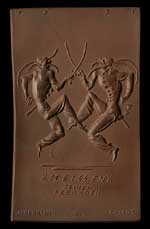 Reliefplatte.MEISSEN 1931 "Taglia Cantoni und Fracasso" Paul Scheurich nach Jacques Callot, Figuren aus der Commedia dell´arte, die ihre Schwerter zur Meissner Manufakturmarke kreuzen, Boettgersteinzeug, numeriertes Exemplar: ...