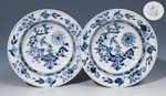Paar Marcolini-Teller.MEISSEN 1774-1814, kobaltblaue Unterglasurmalerei, "Zwiebelmusterdekor" flache Form mit glattem Rand, ø 24 cm (9 1/2 in), Preßmarken, blaue Malermarken, blaue Schwertermarken mit Stern, Literatur: ...