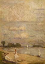 Richter-Lössnitz Georg. 1891 Leipzig - 1938 Großenhain "Mädchen am Flußufer", stimmungsvolle Elbelandschaft, Öl auf Leinwand, signiert, datiert: 1922, rückseitig bezeichnet, partiell restauriert, 94x68 cm (37 x 26 ...