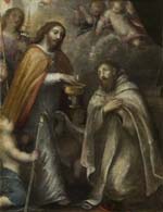 Altmeister 17.Jahrhundert. "Neutestamentarische Szene", Christus mit Hostie über Kelch neben Mönch in weißer Kutte, von Engeln mit Palmzweig, Fackel und Weihrauchgefäß flankiert, Öl auf Kupfer, unsigniert, 24.5x20 ...