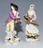 Paar große Figuren.19.Jahrhundert, MEISSEN-Modell von Johann Joachim Kaendler um 1750, Modell-No.1351,1352, "Drehleierspielerin" "Dudelsackspieler" farbig bemalt, gold staffiert, runde Blütensockel mit Felsstütze, ...