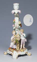 Figuren-Leuchter.MEISSEN um 1860, erste Wahl, Modell-No.783, einflammiger Standleuchter mit plastisch aufgelegten Blütenzweigen, Allegorie "Der Frühling", farbig bemalt, gold staffiert, Vogelbauer und Blüten restauriert, ...