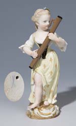 Figur aus der Mädchen-Kapelle.MEISSEN um 1860, erste Wahl, Modell von Johann Joachim Kaendler, Modell-No.2571, "Cellospielerin", farbig bemalt, gold staffiert, Rocaillen- sockel, Höhe: 13 cm (5 in), restauriert, unglasierter ...
