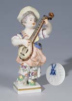 Gärtnerkind. MEISSEN 1967, dritte Wahl, Modell von Michel Victor Acier 1778, Modell-No.G11, farbig bemalt, gold staffiert, quadratischer Sockel, Höhe: 10.5 cm (4 1/4 in), Ritzmarke, Preßmarke, Malermarke, blaue Schwertermarke, ...
