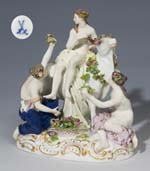 Figurengruppe. MEISSEN um 1860, erste Wahl, Modell von Johann Joachim Kaendler 1765, Modell-No.A 65 "Venus mit zwei Amoretten", farbig bemalt, gold staffiert, Höhe: 23 cm (9 in), partiell restauriert, Felssockel, Ritzmarke, ...
