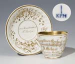 Große Tasse, Untertasse. KPM BERLIN 1837-1844, Hausmaler, reiche Goldstaffage, Schriftzüge: "Zur goldenen Hochzeit meinem lieben Schwager J.Gebser Erfurt, den 3.Mai 1864-von Ihrer Schwägern F.Trantzschel" Höhe: 8 cm ...