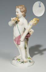 Hölbe, Rudolf. 1848 Lemgo - 1926/Dresden, MEISSEN 1870-1923, erste Wahl, Modell-Jahr: 1882-1885, Modell-No. N 195, "Amor, Nachtigallen fütternd", farbig bemalt, gold staffiert, Höhe: 44.5 cm (17 3/8 in), partiell restauriert, ...