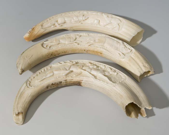 3er Satz Stoßzähne mit Reliefschnitzerei.