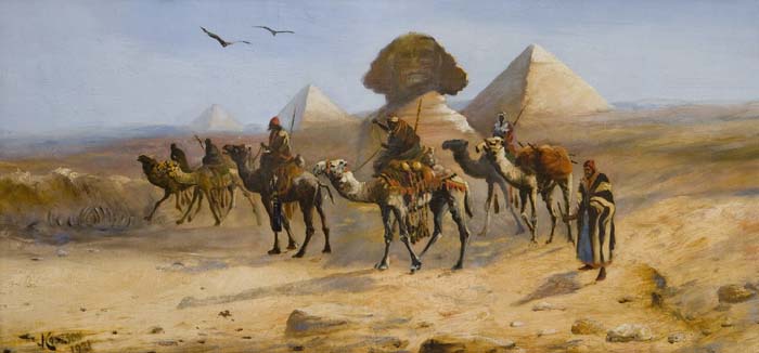 "Arabische Kamelreiter vor den Pyramiden in Gizeh",