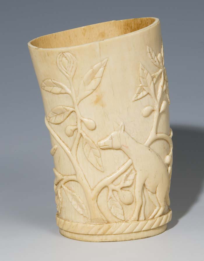 Elfenbein, im Relief geschnitzt, ovaler Korpus ohne Boden,