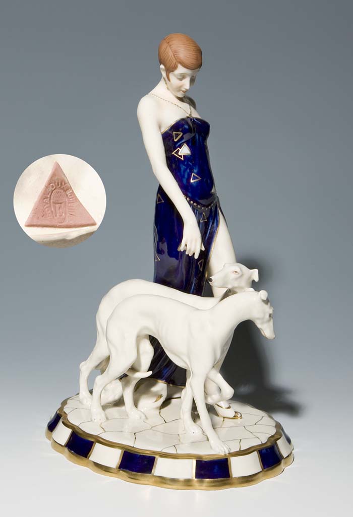 "Dame mit zwei Windhunden", profilierter Ovalsockel,