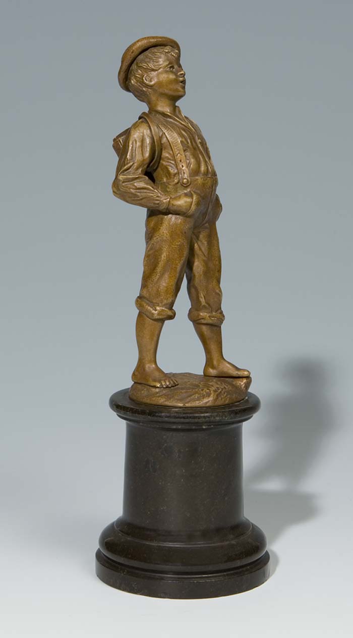 "Schulbub mit Hut und Ranzen", barfüßig,