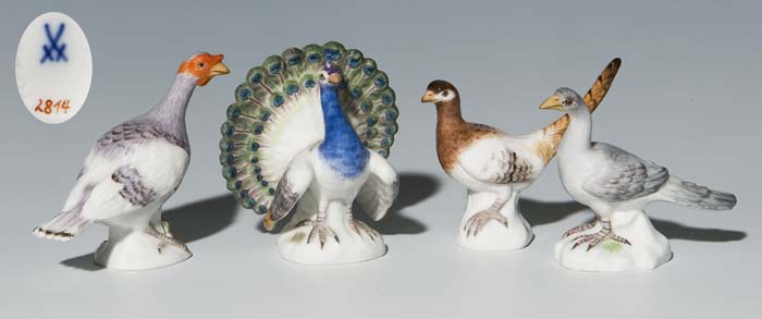 4er Satz kleine Tierfiguren. MEISSEN 1999-2007, erste Wahl, Modell-Jahr: um 1750, Modell-No.77170, 77017, 77011, 77013, (alte Form-No.1664, 9x, 6x, 7x), "Truthenne", "Radschlagender Pfau", "Fasan", "Pfauhenne", naturalistisch bemalt, Höhe: 4.5-5.5 cm (1 3/4-2 1/4 in), Ritzmarke, Malermarke, blaue Schwertermarke, Literatur: Meissen: Bunte Vögel Meissen Manufaktur-Preis 388,-Euro, 376,-Euro, 354,-Euro und 668,-Euro, zusammen 1786,-Euro