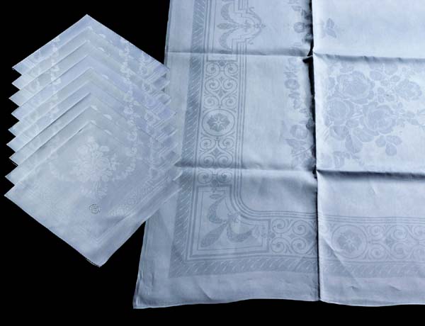 sehr feiner Leinendamast, Blüten-und Rankenbordüre mit