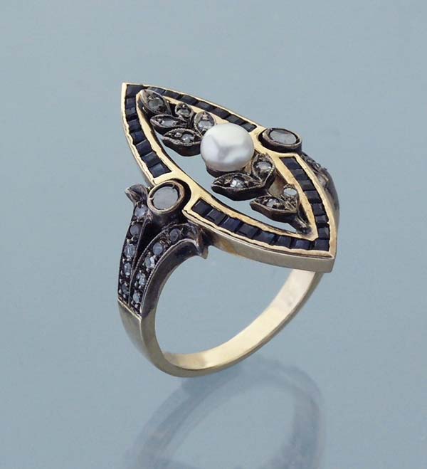Diamant-Saphir-Perlen-Ring.585er Gelbgold/Silber