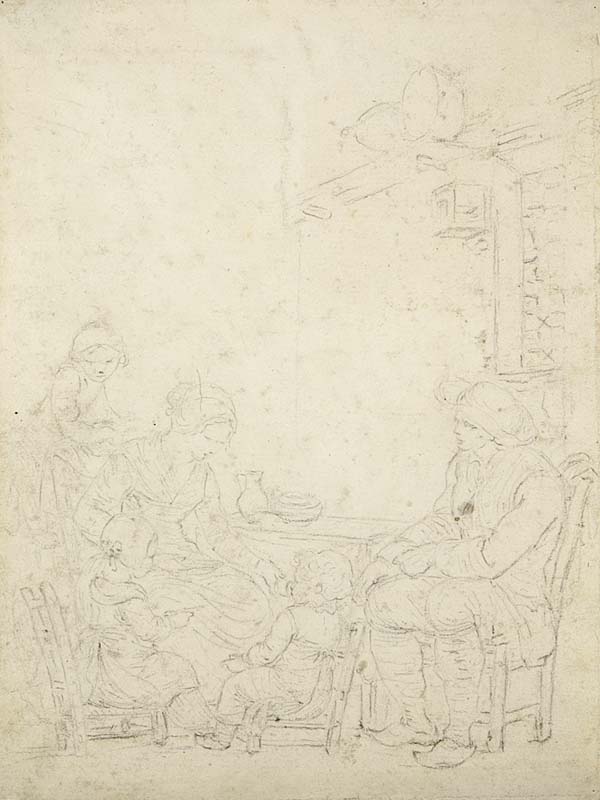 "Junge Familie am Tisch", Bleistiftzeichnung, unsigniert