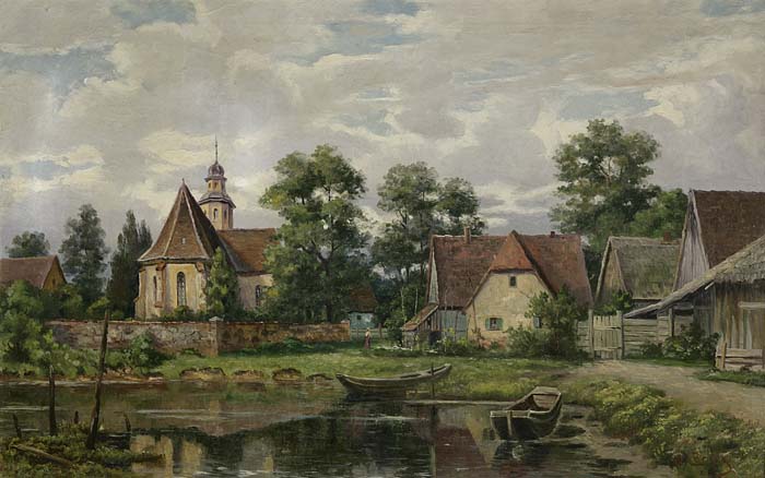 mit Kirche, Teich, Boot-und Personenstaffage,