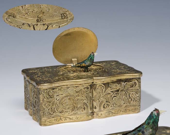 Vögel, auf dem Deckel Ovalreserve mit farbiger Emailmalerei,