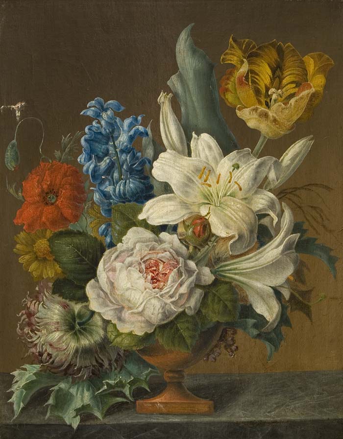 "Blumenstilleben auf einer Steinplatte" in zartem Kolorit,