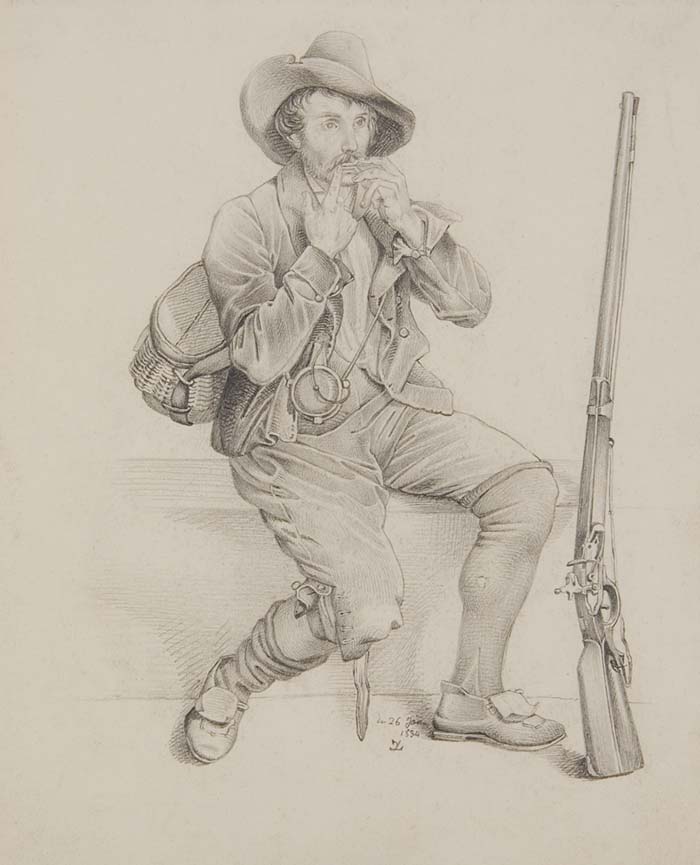 "Jäger mit Gewehr, auf einer Maultrommel blasend"