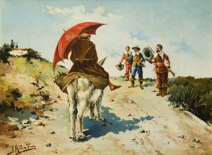 Landschaft, drei Musketiere grüßen ehrwürdig einen Mönch,